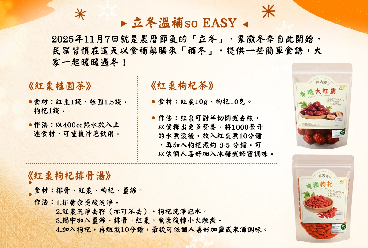 於活動期間內加入安美日選物所會員並填妥會員資料(姓名、電話、地址、mail),即可抽限量有機大紅棗。